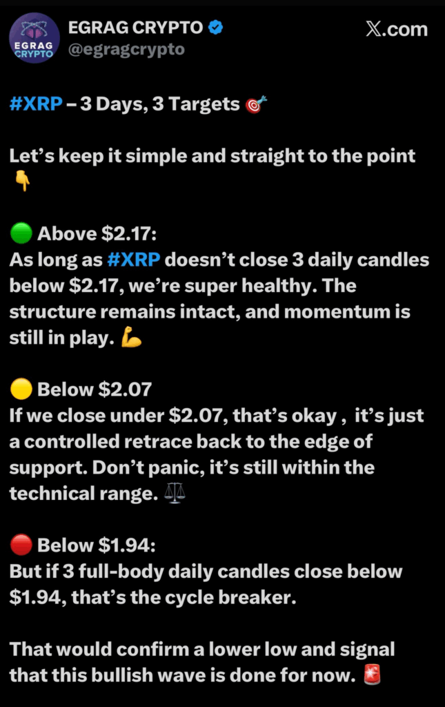 分析师EGRAG CRYPTO指出,若XRP跌破1.94美元,将确认周期转折点,意味着当前上涨趋势暂告段落。反之,若能守住2.07或2.17美元支撑位,则看涨结构依然有效。