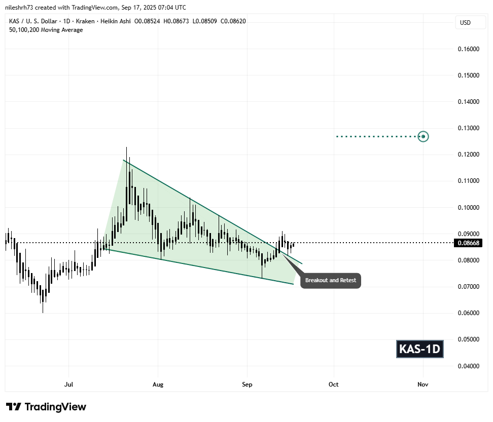KAS当前温和上涨,但图表揭示了更重要的技术进展:该代币已确认突破下降楔形形态,并正在进行回测——这种形态通常为强劲的持续上涨奠定基础。
