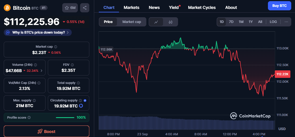 截至发稿,比特币报价112,225.96美元,24小时微跌0.55%。价格走势图显示持续波动特征,交易量同步出现显著变化,反映市场不确定性加剧。