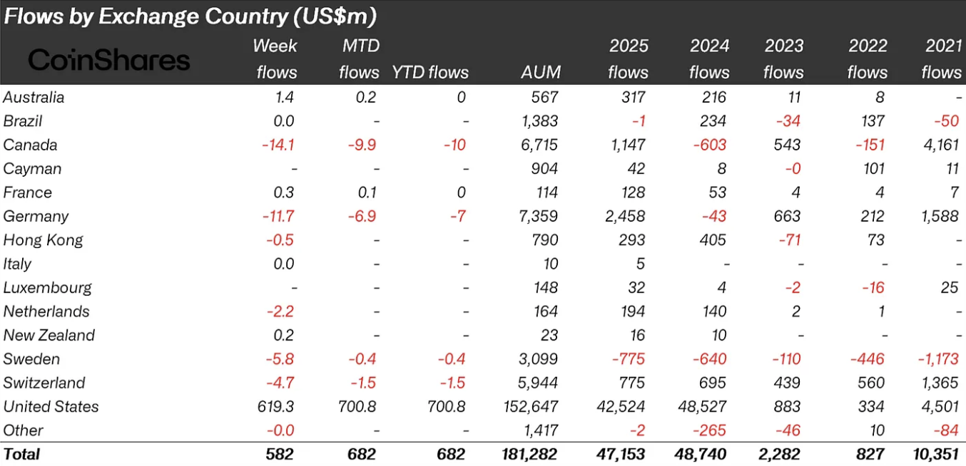 数据显示美国在全球资金流入中占据绝对主导,2025年规模达425亿美元。虽然较2024年下降12%,但由于新资金主要通过美国上市的投资产品进入,其领先地位依然稳固。