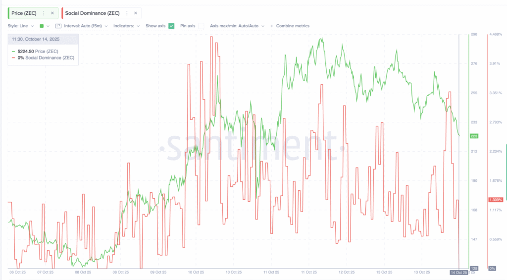 Santiment数据显示,Zcash的社交主导地位在10月10日达到峰值后急剧下降。讨论量减少与价格回调同步,但该模式与10月初的走势相似——当时类似下跌后出现了突破性上涨。