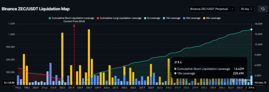 Coinglass衍生品数据显示空头头寸正在快速积累。当前价位下方存在1640万美元空头杠杆,而多头杠杆仅520万美元。这种极端空头倾向意味着若ZEC突破255美元,可能引发轧空行情。