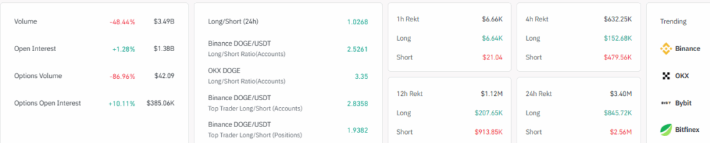 币安与OKX交易所的多空比率显著偏向多头。过去24小时空头清算量更高,暗示市场存在向上修正需求。这一布局显示若狗狗币能在需求区间内企稳,市场对反弹的预期正在升温。