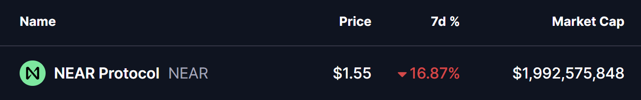 加密货币市场持续面临沉重的抛售压力,这波下跌波动已蔓延至主要代币,包括Near Protocol (NEAR)。在最近一周的回调中,该代币跌幅超过16%,反映出市场整体疲软。