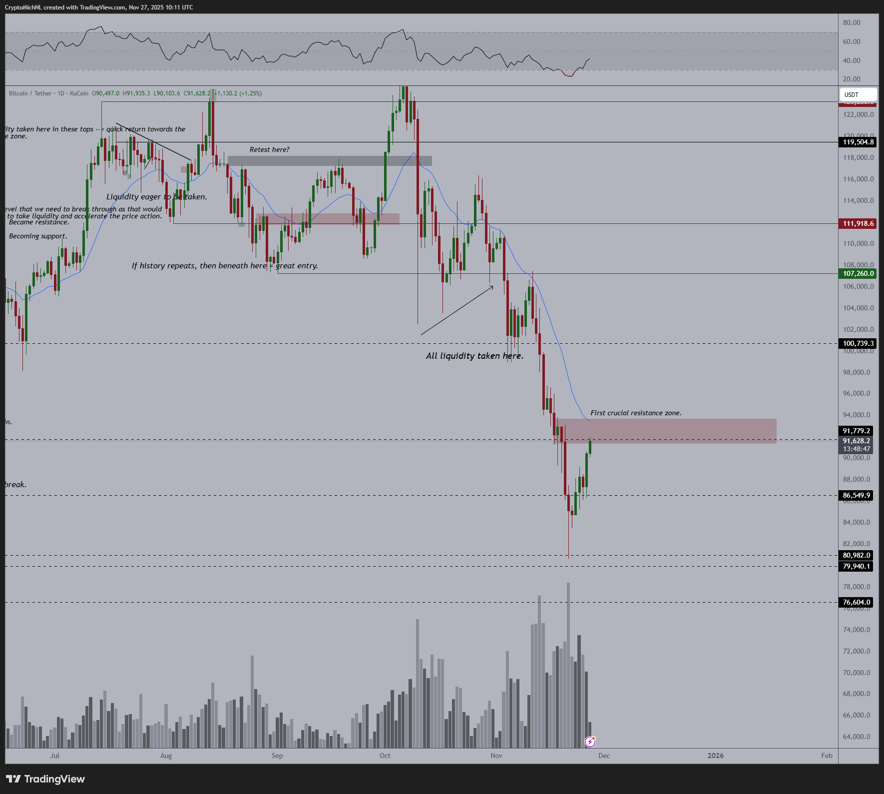 “关键时刻将至。比特币正接近关键水位,一旦突破将再度触及十万美元,展现强势攀升态势。在攻克阻力前,预计将经历一段盘整。八万八千美元附近的回测不足为虑,但若能有效突破该位置,将大幅提高筑底可能性。本轮周期尚未终结。”