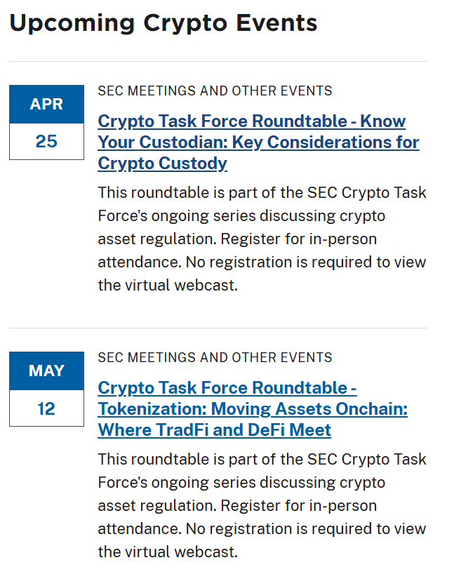 当我们宣布即将举行的加密货币圆桌讨论时,我们第一时间通知了您。随着新会议日期的临近,SEC分享了更多细节。会议将于4月25日举行,重点关注加密货币托管服务。