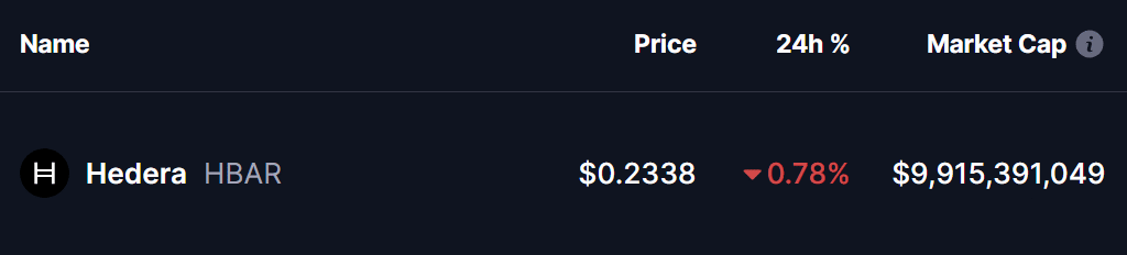 日线图上,HBAR近期持续在下降三角形形态内震荡整理——该形态通常被视为看跌延续结构,其特征是不断下移的高点与水平支撑线逐渐收敛,直至出现方向性突破。尽管多次测试,HBAR始终坚守0.2260美元支撑位,每次下探该区域都伴随稳健买盘,暗示有大资金正在吸筹。现报价0.2341美元,略低于50日均线(0.245美元)及下降趋势线阻力位。