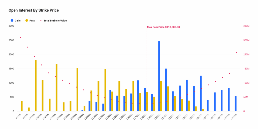 最大痛点价格为11.8万美元,显著低于当前市价。这意味着比特币价格回调至最大痛点的概率较低,而12万和12.1万美元执行价的看涨期权持仓量较高。24小时看涨期权交易量超过看跌期权,0.87的看跌/看涨比率显示交易者在中性情结下谨慎买入看涨期权。
