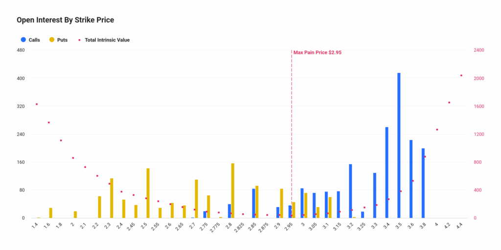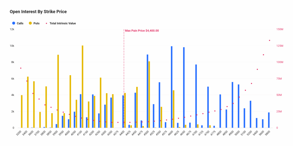 以太坊方面,21.5万份名义价值约9.3亿美元的期权即将到期,看跌/看涨比率为0.92呈现轻微看跌。最大痛点价格为4,400美元,高于当前市价。执行价附近的看跌期权持仓较高,表明市场倾向通过压低价格来减少损失。