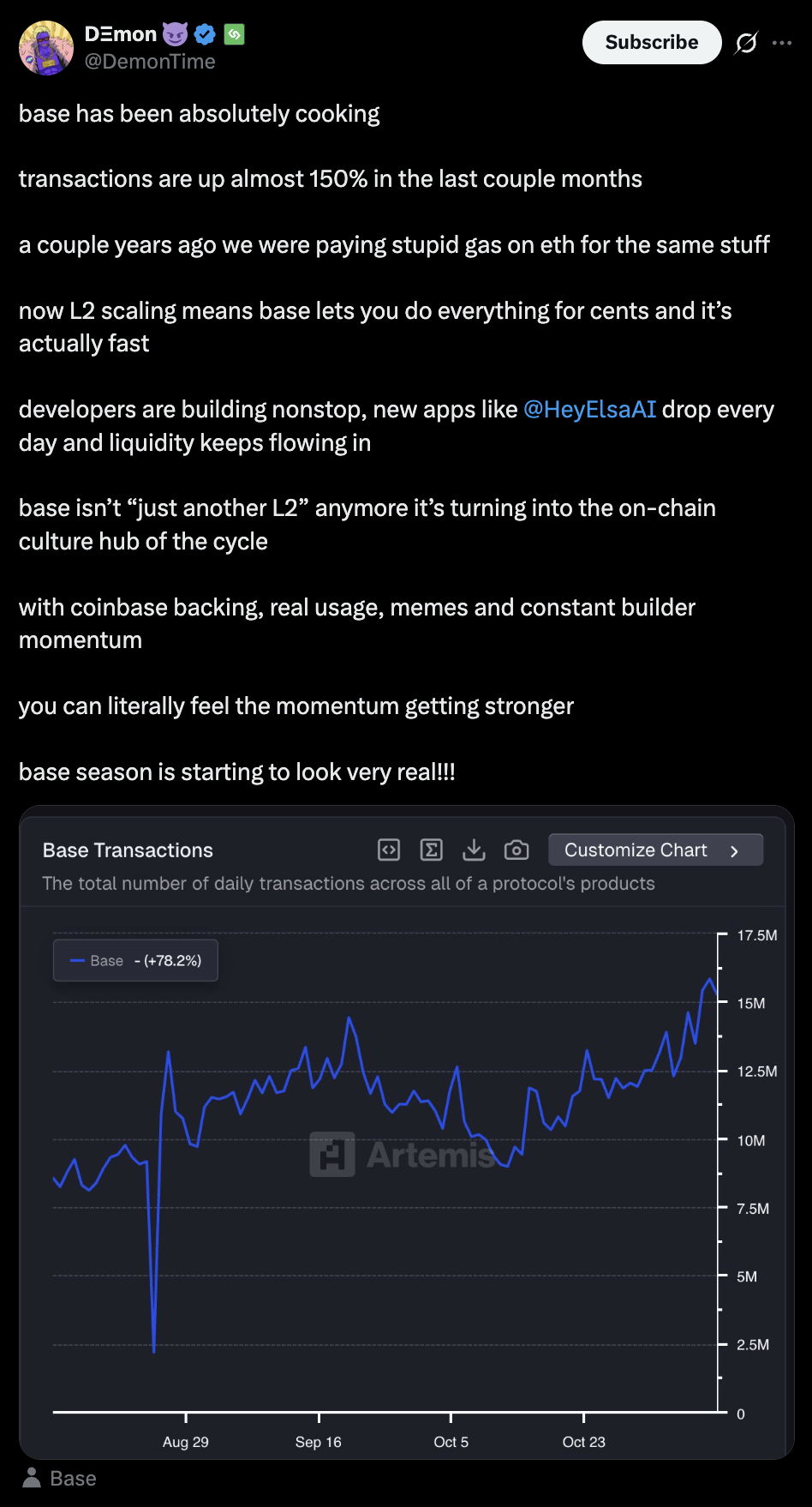 Layer2领域的情况则更为复杂。虽然该领域总市值较高点回落30%,创新仍在持续推进。即便市场震荡期间,Layer2的日交易量仍创下新纪录,部分生态系统突破240万笔。分析师Demon Time在X平台的精准点评道出Layer2现状,特别指出基于以太坊的Base网络交易量自10月中旬以来激增150%,呈现“爆发式增长”。