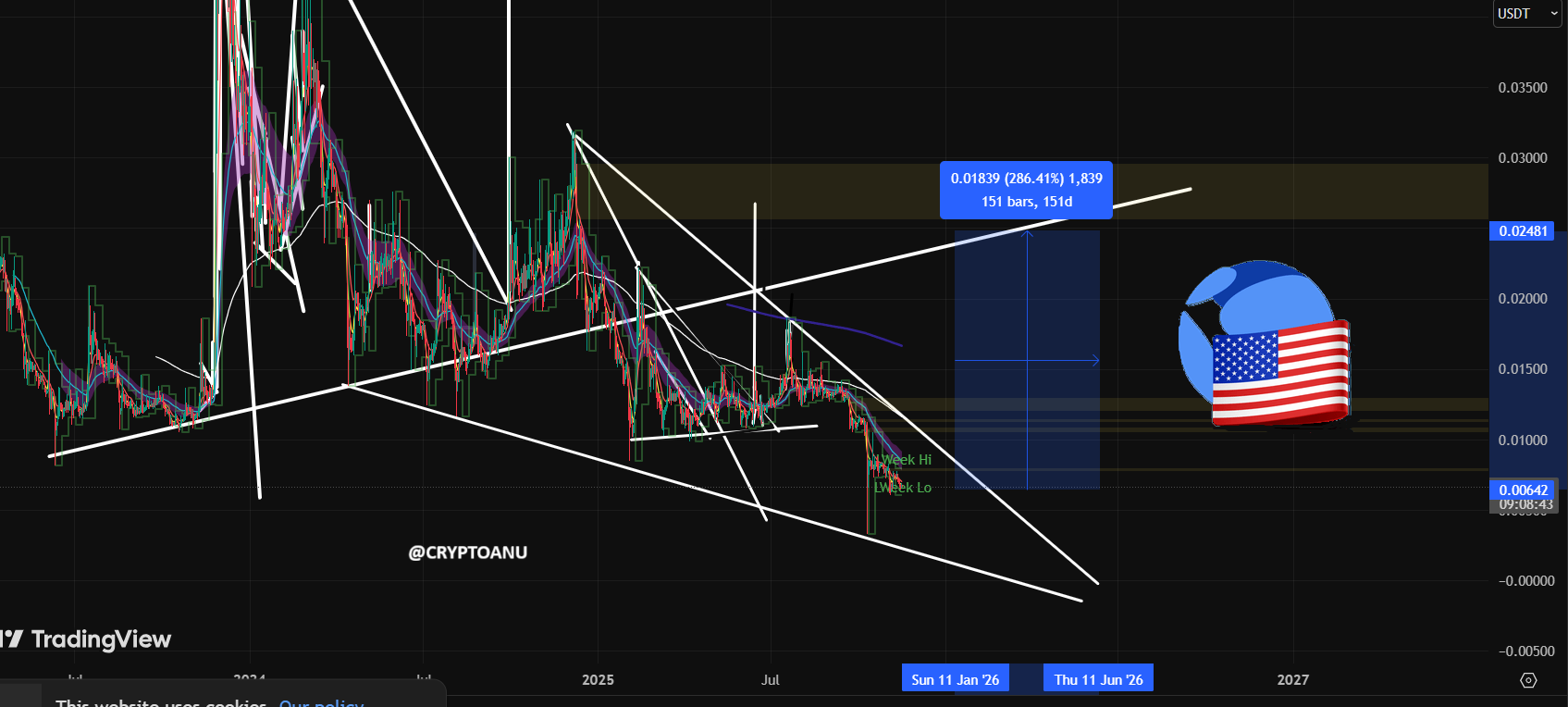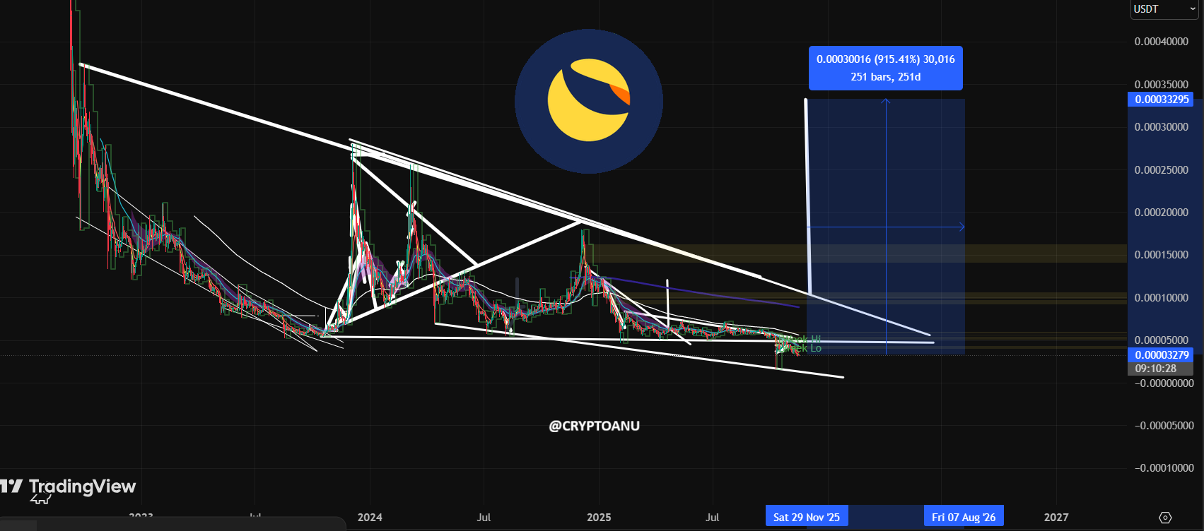 自2022年中期以来,LUNC始终处于大型下降楔形结构中。历史数据显示,当这种形态配合以下特征时,往往成为加密货币市场最可靠的反转信号:波动率持续收缩、支撑位反复验证、基本面催化剂涌现。当前价格已抵达楔形末端,这意味着横向整理即将迎来方向性突破。这种级别的价格压缩自2023年初以来首次出现,而如此剧烈的压缩通常只导向一个结果:爆发式扩张。
