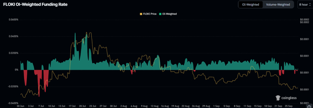 Coinglass的持仓量加权资金费率数据显示市场情绪波动。该指标追踪杠杆头寸投资兴趣,与$FLOKI价格走势高度相关。2025年6月至9月期间,资金费率与价格变化呈现直接关联——正值资金费率通常预示价格上涨,而负值则对应价格下跌。