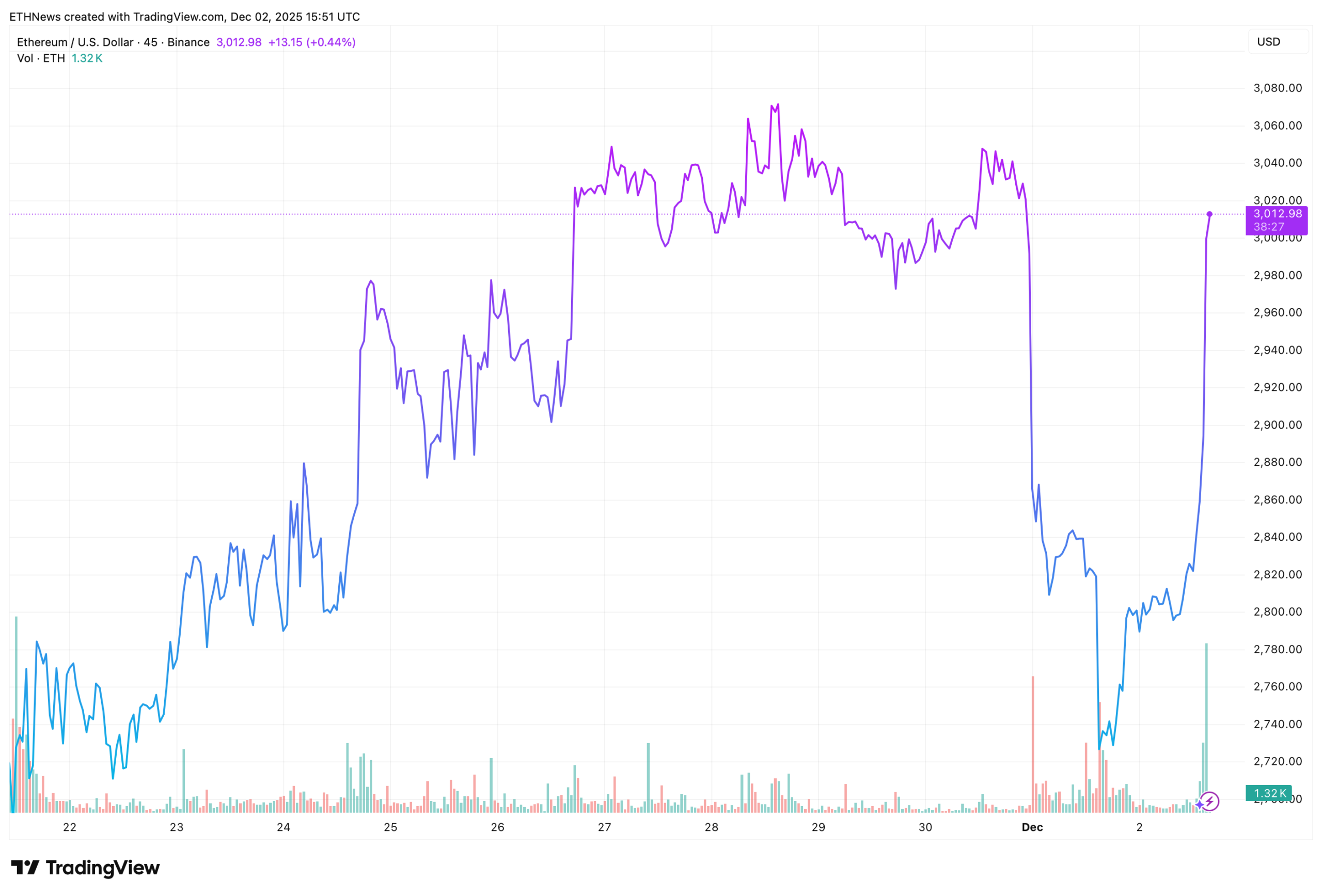 在尾盘剧烈反弹后,以太坊重新站上3000美元关口,延续了24小时内超越比特币涨幅的上升态势。尽管市场仍面临高波动性与宏观不确定性,但此次动能转换显示低位价格区域出现新的买盘需求。