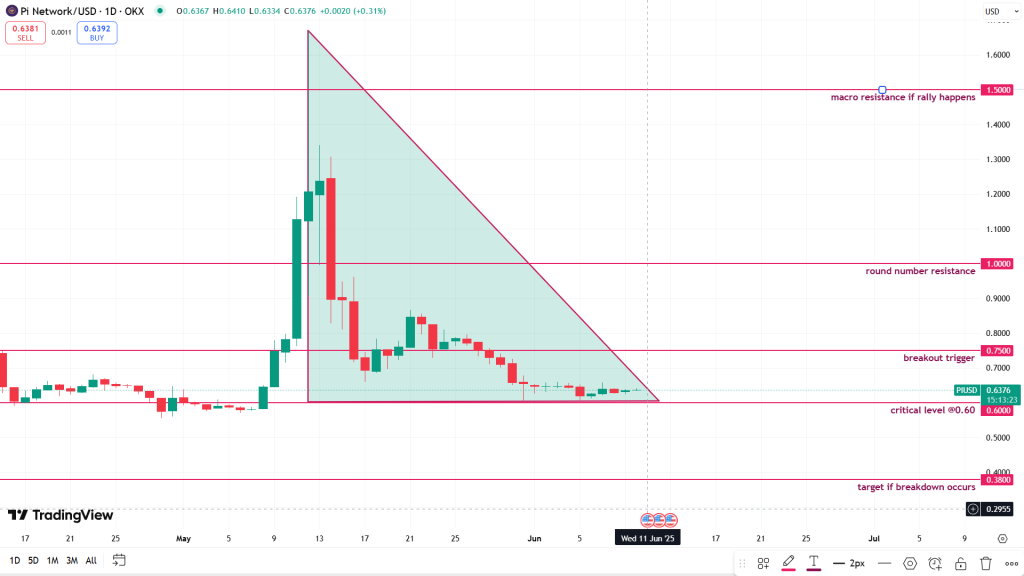 即将于6月28日举行的Pi日2.0活动预计将成为项目转折点。社区普遍期待三大关键进展:开放主网上线的明确时间表(这是登陆中心化交易所的必要条件);去中心化应用(DApps)与实体商户整合方案的公布;以及关于314.159美元全球共识价值(GCV)的官方说明。若这些承诺切实落地,Pi币或将强势反弹,甚至试探1美元及以上价位。反之,若活动缺乏实质性内容,价格可能失守0.60美元支撑,进而引发更深度的回调。