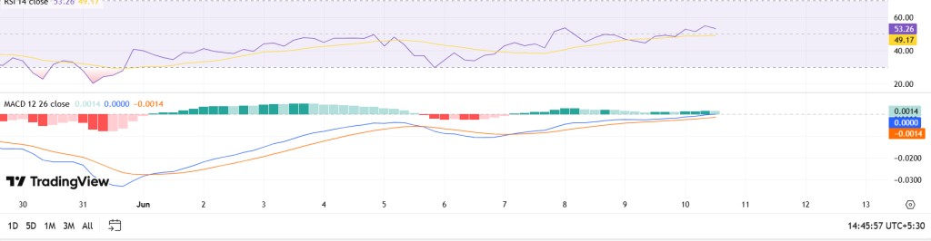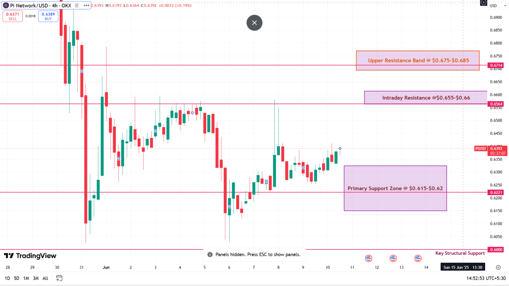 截至2025年6月10日,Pi币(PI/USDT)在4小时图表上围绕0.6375美元窄幅震荡,波动区间介于0.62至0.66美元之间。短期指标显示轻微的多头动能正在积聚,但整体趋势仍不明朗。RSI(14)当前位于53.36,呈现中性强度;而MACD已形成微弱的金叉(MACD:0.0015,信号线:0.0014)。这些指标暗示日内或存在短线交易机会,尤其在明确的价格区间内。
