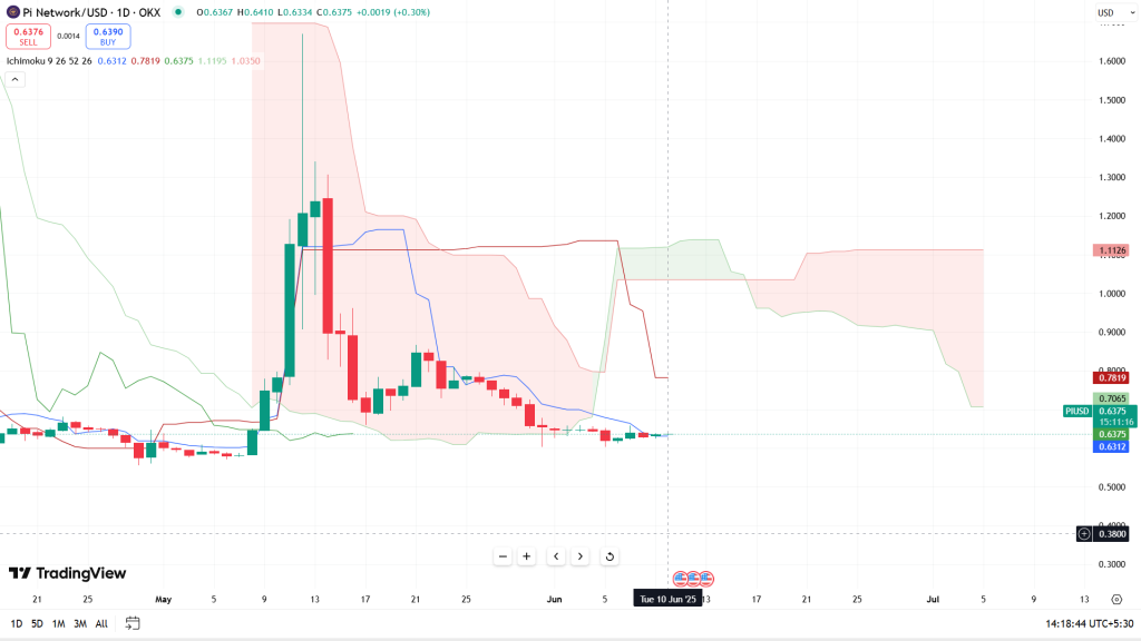 Pi币(PI)目前正于0.65美元下方盘整,逐渐逼近0.60美元的关键支撑位。包括RSI、MACD和一目均衡表在内的技术指标均显示下行压力持续加剧。自5月以来,其日交易量暴跌超90%,链上活跃度陷入停滞。尽管整体市场情绪仍趋谨慎,但在4小时时间框架内或仍存在短线交易机会。所有目光都聚焦于6月28日的"Pi日2.0"活动,该事件或将决定代币的短期走势。