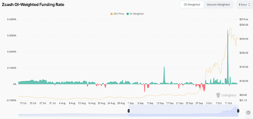 10月初ZEC成功突破150美元后开始快速攀升。此后不久,资金费率急剧上升,显示大量交易者正急于建立多头头寸,期待价格持续上涨。这类飙升往往暗示市场过度乐观。在此次暴涨前,资金费率曾在9月下旬短暂跌入负值区域,表明当时存在些许看跌情绪。