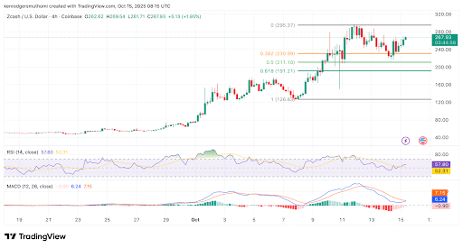 除市场动能外,技术指标显示Zcash正处于强劲上升趋势。根据TradingView数据,ZEC近期从接近295美元的高点经历小幅回落。57.8的RSI值表明存在良好动能且未进入超买区域。