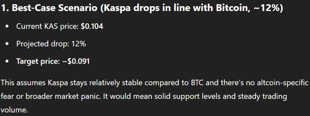 我们决定询问GPT,如果比特币跌回90,000美元,Kaspa的价格可能会发生什么变化。历史上,当比特币下跌时,山寨币往往会跌得更厉害。这是由于几个原因:更高的波动性、更弱的流动性,以及交易者在市场不确定性期间倾向于转向比特币或稳定币。