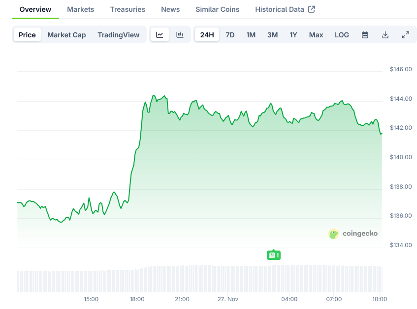 加密货币分析师Ali通过链上分析识别出142美元处存在强劲阻力。过去约有1300万枚SOL代币在此价格水平积累。这种集中度形成了一个供应墙,可能会阻止价格上涨。
