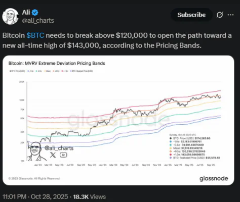 分析师Ali指出比特币需突破两个关键位:111,160美元支撑位和117,630美元阻力位。若成功突破11.7万美元,则有望冲击12万美元大关,最终可能达到14.3万美元峰值。