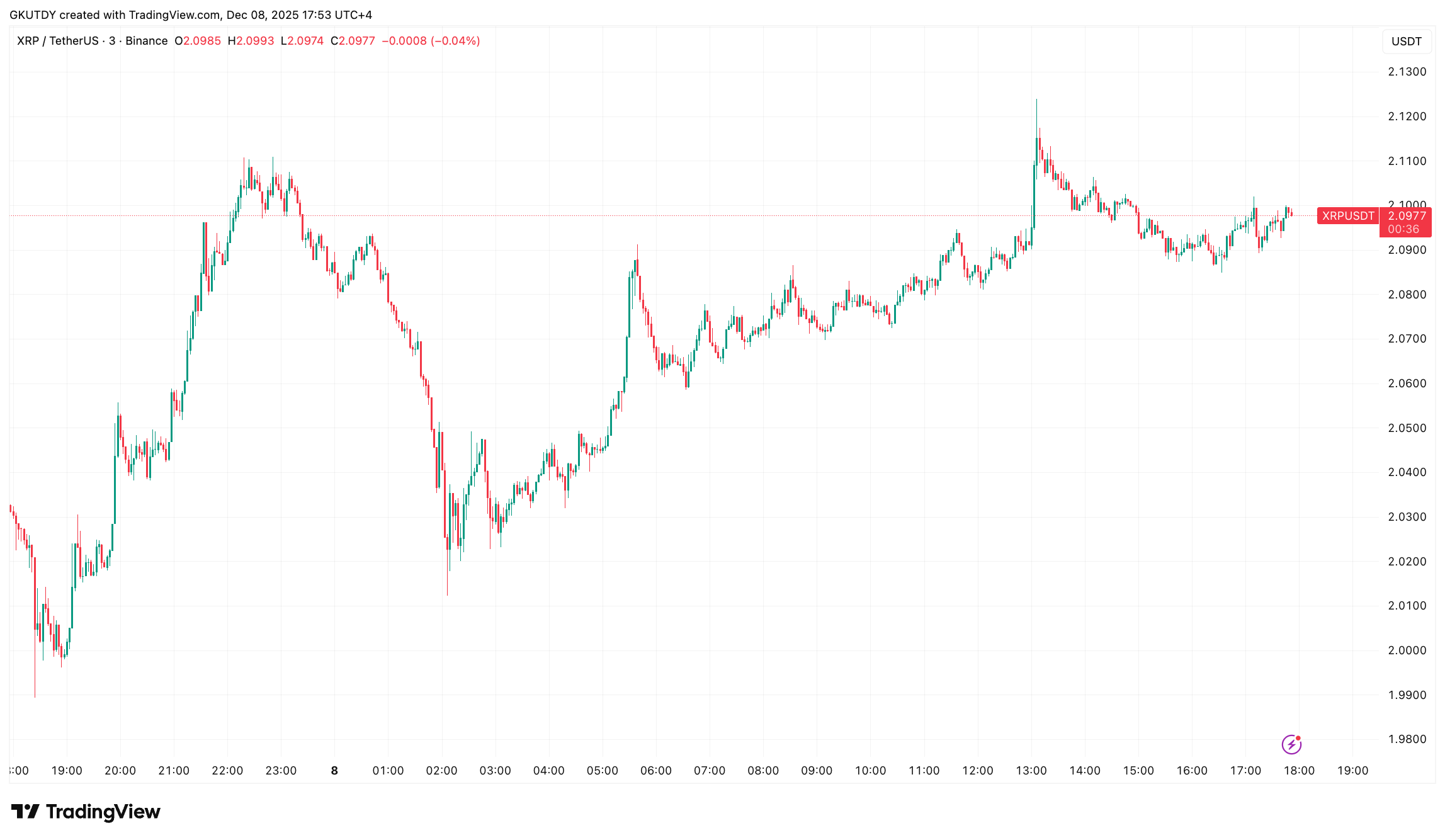 消息传开后,XRP日内应声上涨,逼近2.09美元关口。此番上涨虽与整体市场走强同步而非独立行情,但显示出交易员正密切关注相关动态。
