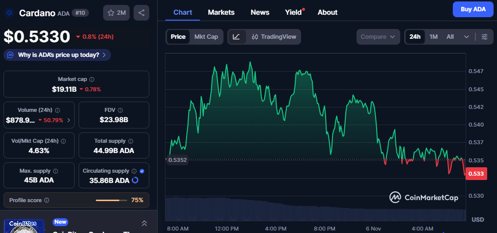 卡尔达诺ADA代币当前交易价约为0.535美元,过去24小时微跌0.8%。尽管近期价格波动,ADA在0.532美元附近显示出支撑位,阻力位则位于0.547美元附近。