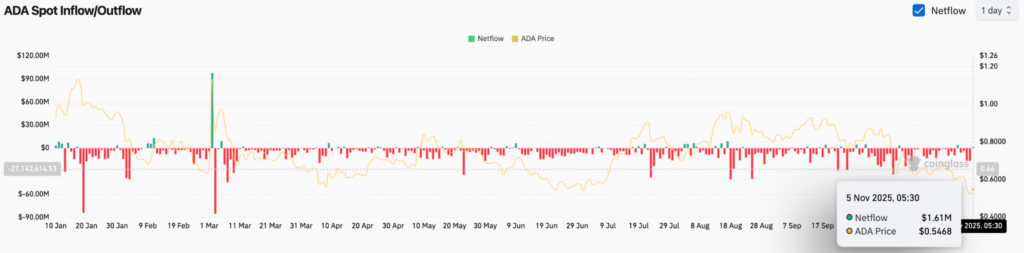 虽然最近净流入略为正值(161万美元),但整体派发态势仍在延续。通常情况下,净流出现象意味着交易者逢高抛售而非增持ADA代币,这可能暗示市场对长期反转缺乏信心。