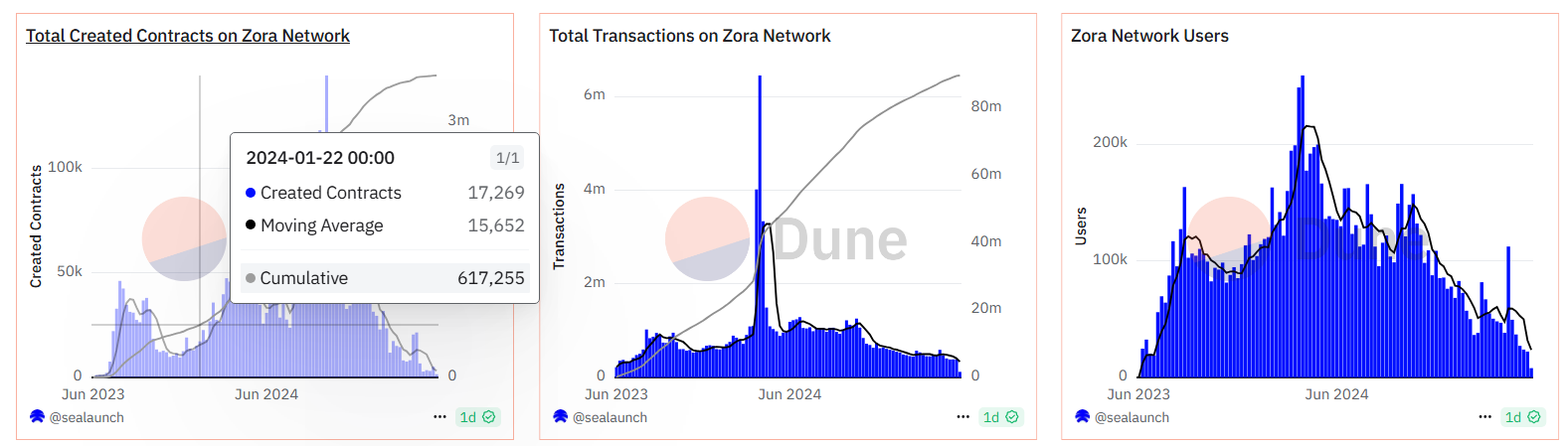 然而价格走势与平台实际网络活动形成鲜明反差。链上数据显示Zora正面临持续的使用率下滑。根据Dune Analytics统计,该网络创建的智能合约总数从2024年10月14日的144,402份锐减至6月2日的1,549份。交易量也从历史峰值645万笔跌至12.1万笔,活跃用户数由近25.9万下滑至约8,000。这些数据表明,尽管艺术家合作带来新热度,Zora网络的整体用户参与度和开发者活动仍在持续走弱。
