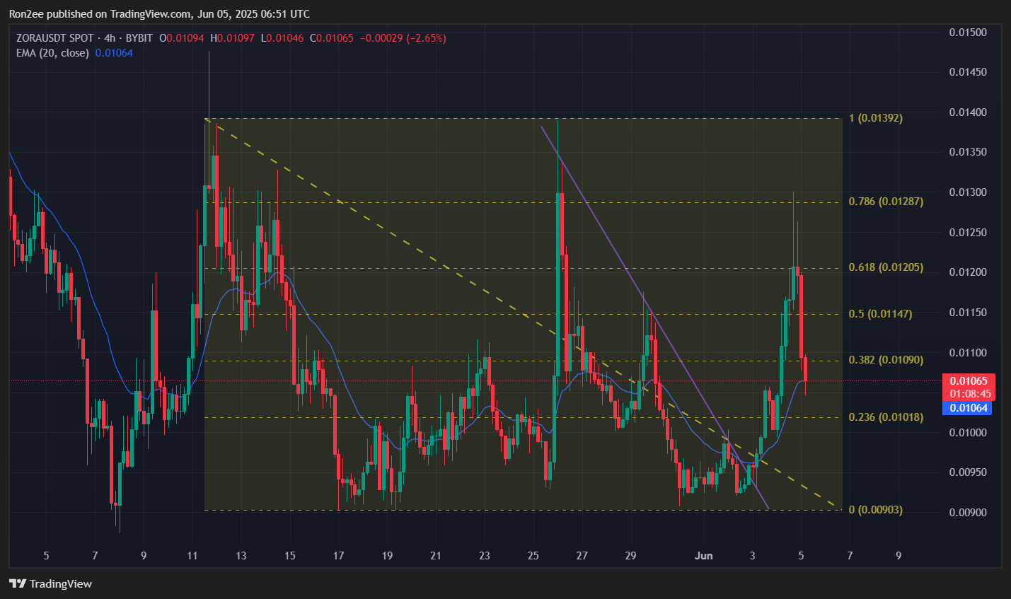 4小时图表显示,ZORA于6月5日突破自5月26日形成的下降趋势线,触发最新一轮反弹。但宏观视角下,该代币已在0.013美元附近形成双顶形态(5月11日与5月26日两个峰值),这通常被视为看跌反转信号。
