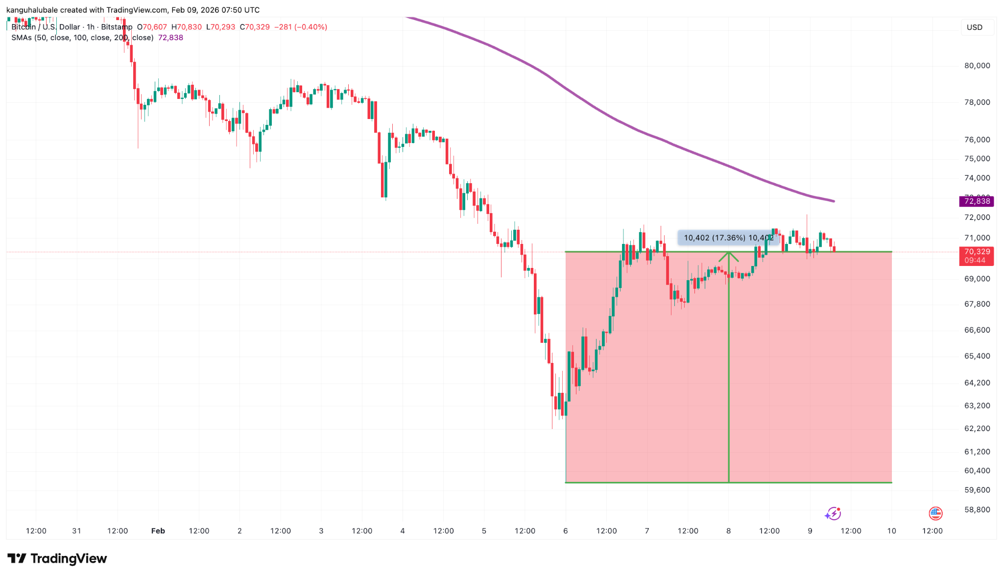 比特币(BTC)在周一从低于6万美元的15个月低点反弹17%,交易价格接近7万美元,原因是鲸鱼趁低价买入积累。