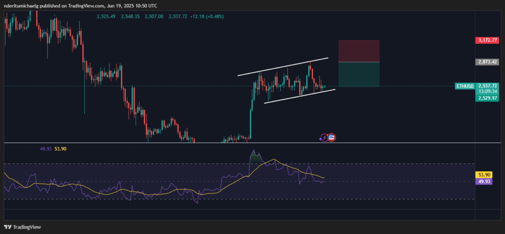 此次支撑测试恰逢RSI指标回落至50%中轴线,这一共振现象增强了价格在上升通道内震荡后反弹的可能性。观测时点ETH已小幅回升至2,500美元上方,预计至少存在15%的上行空间才会再次触及上升阻力线。