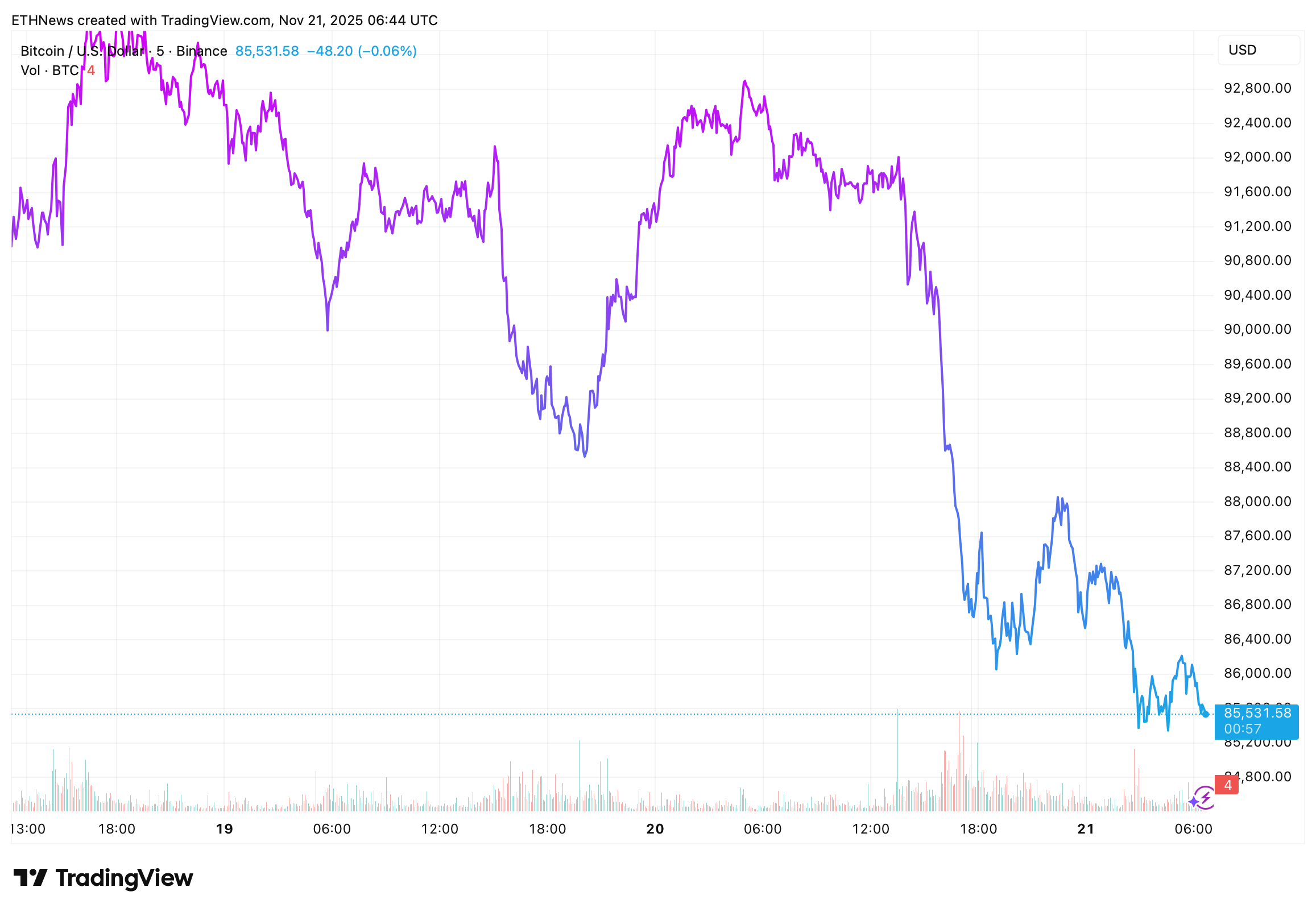 11月21日凌晨交易时段,比特币跌破8.6万美元关口,延续了本轮周期中最剧烈的下跌行情之一。根据您提供的TradingView图表显示,最新一轮下跌来势汹汹——比特币击穿支撑位后加速下探,而股票与贵金属却持续创出新高,这种反差进一步加剧了市场焦虑。