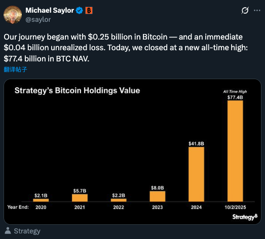 在比特币重回12万美元之际,微策略创始人迈克尔·塞勒自豪地表示,该公司于2020年8月首次购入2.5亿美元比特币后,随即在市场回调中面临4000万美元未实现亏损。但截至2025年10月2日,其比特币持仓价值已达创纪录的774亿美元。
