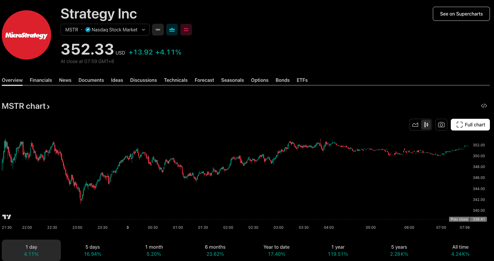 根据美国财政部与国税局发布的过渡指引,微策略(Strategy)公司因其比特币持仓未实现收益,预计无需缴纳数十亿美元的企业替代性最低税(CAMT)。MSTR股价已连续多日上涨,昨日收报352.33美元。