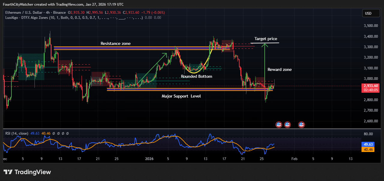 以太坊价格在2850美元重要支撑位附近经历近期盘整后显现复苏迹象。4小时图表显示,ETH从3250美元阻力区回落后正尝试企稳。技术指标表明价格可能向盈利区域反弹,初始目标价位接近3300美元,多头正力图收复前期高点。
