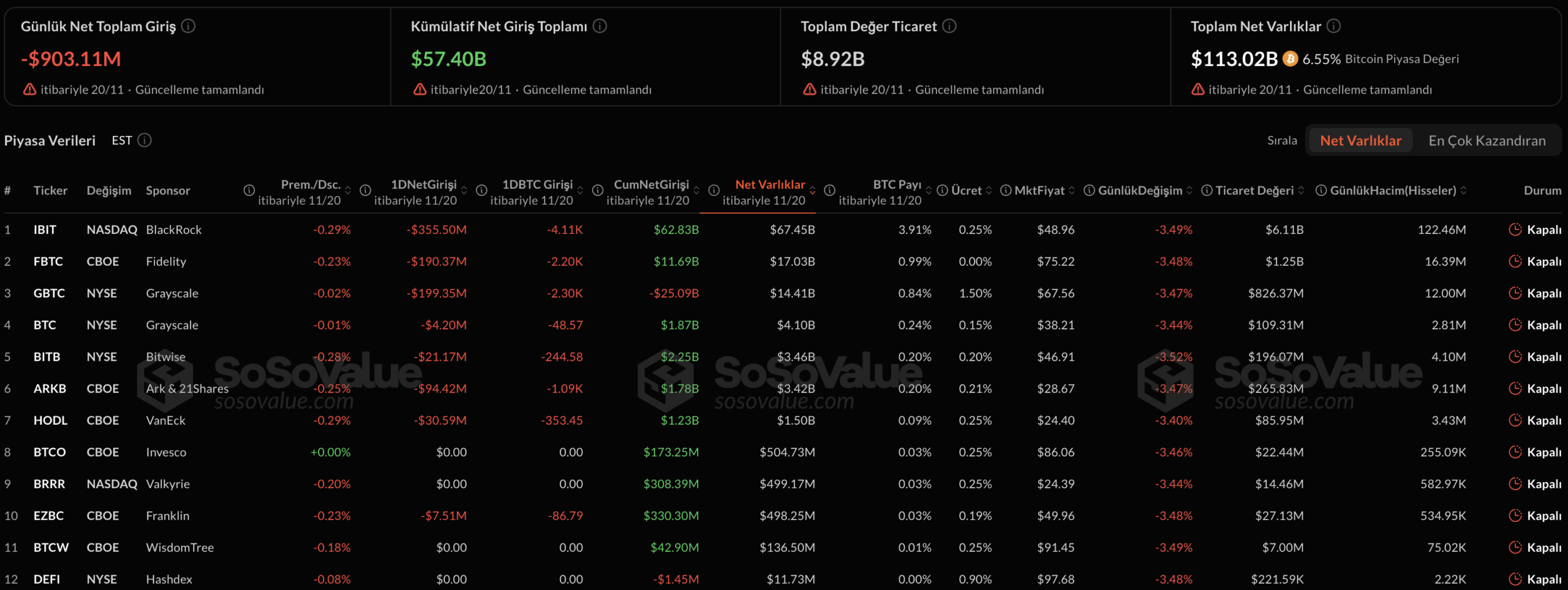根据SoSoValue数据,美国八支比特币ETF总净流出达9.0311亿美元。其中黑石集团IBIT基金遭遇3.555亿美元最大规模撤资,灰度GBTC流失1.9935亿美元,富达FBTC面临1.904亿美元流出。Bitwise、Ark & 21Shares、VanEck和富兰克林邓普顿旗下基金同样出现资金外流。
