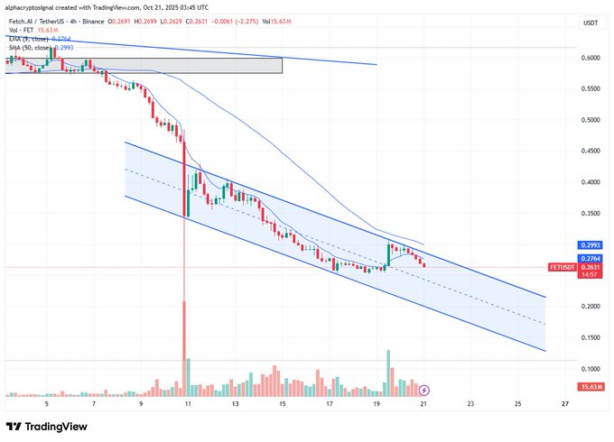 Fetch.ai(FET)正处于稳定的下跌通道中,呈现明显的卖压。四小时图上代币价格持续走低,形成更低的高点和低点,显示市场疲软。最新数据显示,FET现报0.2612美元,24小时跌幅达10.58%,市值降至6.1939亿美元。