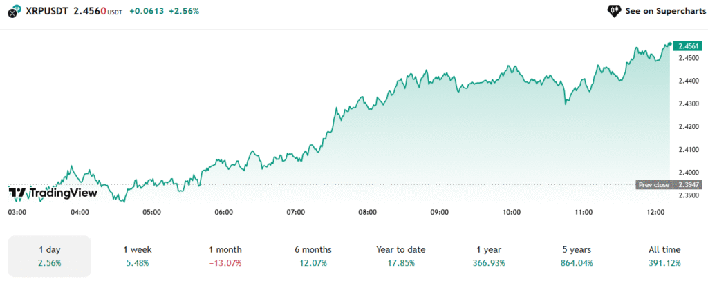过去24小时内,XRP价值攀升2.56%至2.4560 USDT,展现出强烈的看涨趋势。这波上涨始于早盘交易时段,全天保持稳定上行。市场在短暂回调期间始终由买方主导,显示出持续需求。