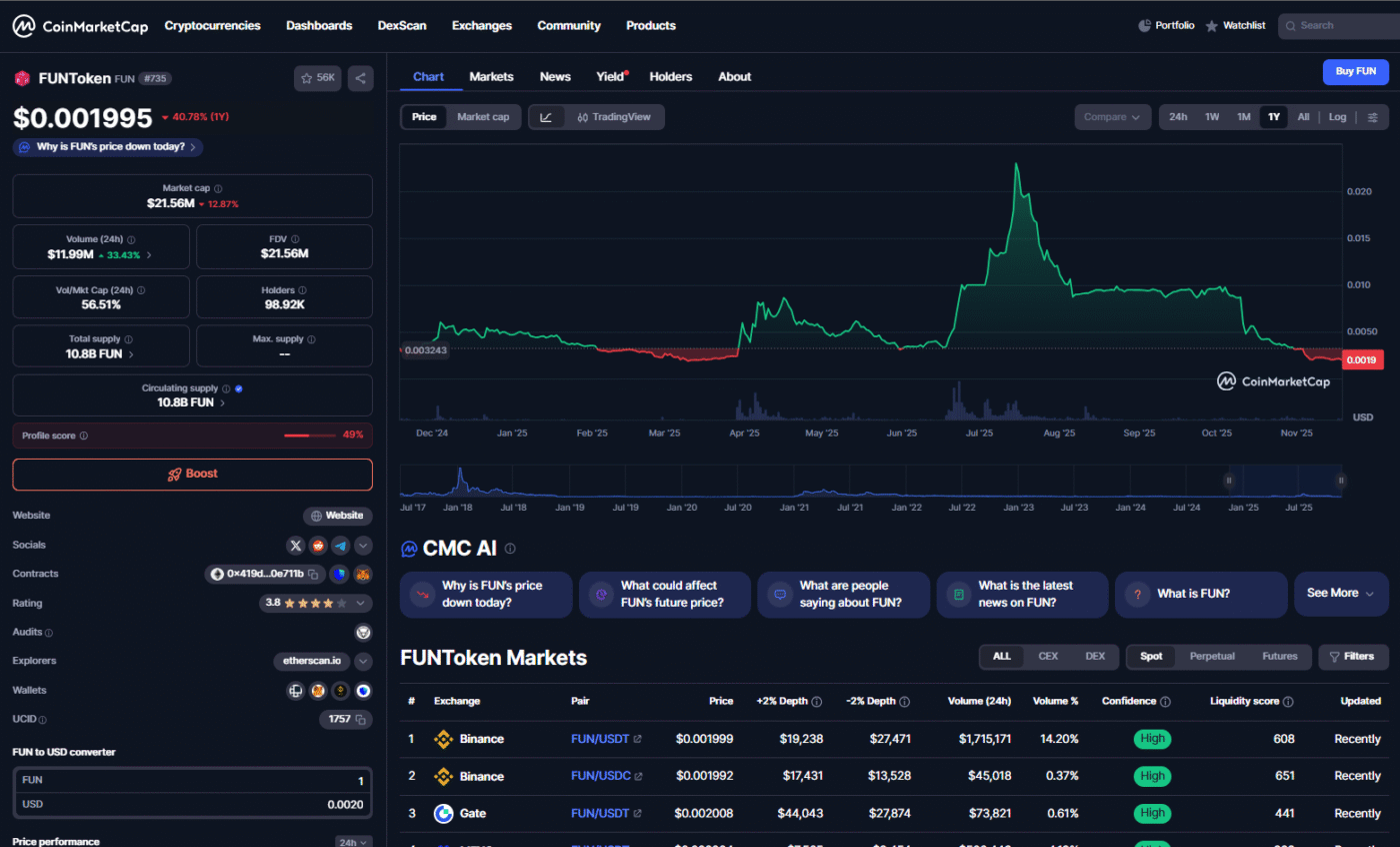 根据最新CoinMarketCap数据,$FUN现报0.001997美元,处于五个月来最低区间