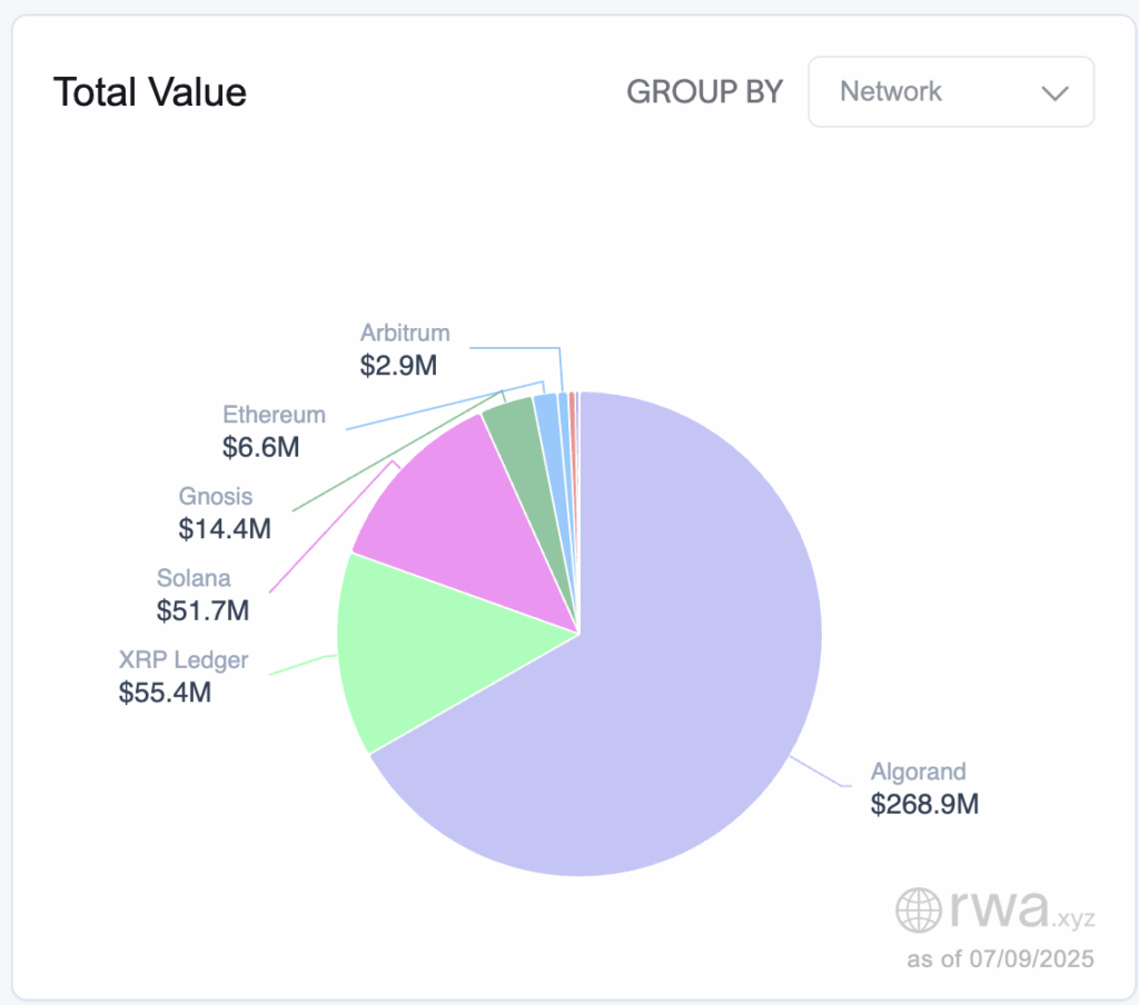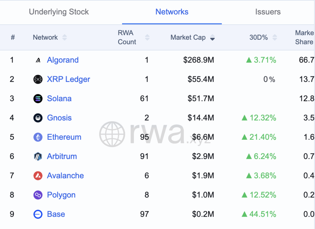 当Algorand停滞不前时,以太坊、Base和Arbitrum等网络已支持数十种代币化资产,部分平台资产数量超过90种。这些网络更吸引了