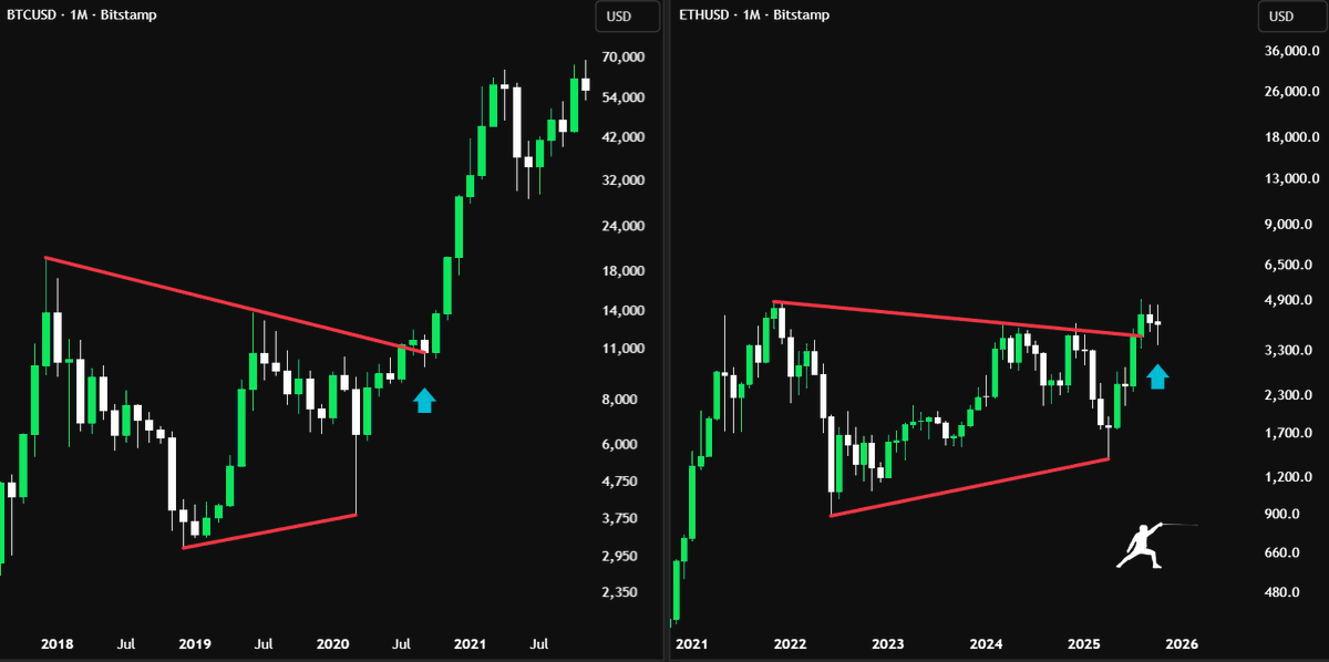 另一位分析师Rekt Fencer则观察到更宏大的技术图景。他认为当前以太坊结构与比特币2020-2021年突破形态高度相似(当时BTC从1万美元飙升至近7万美元)。按照此分形推演,以太坊本轮周期或剑指15000美元。"无需过度解读",他强调了对这一宏观形态的信心。