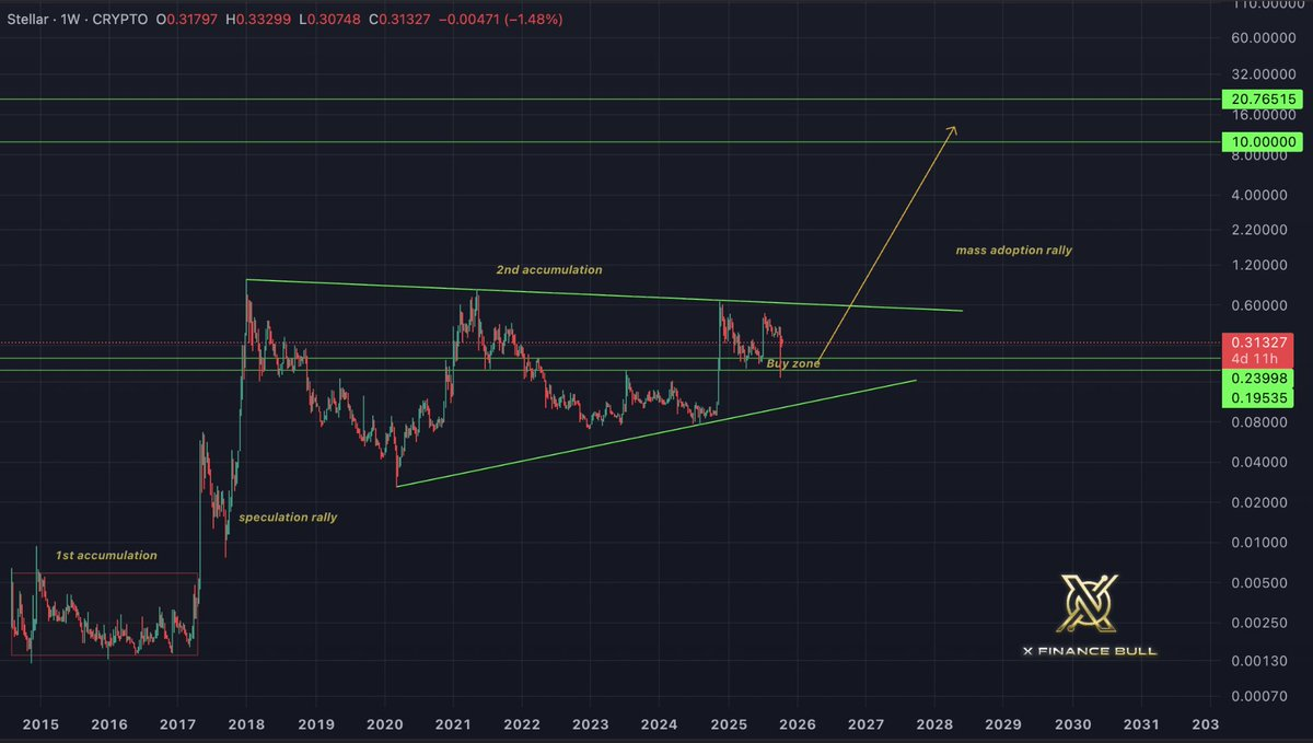 0.31美元附近交投的XLM自2022年以来形成的数年盘整基底,被分析师视为下一轮大涨的跳板。每日超2亿美元的交易量及99亿美元市值彰显其韧性。