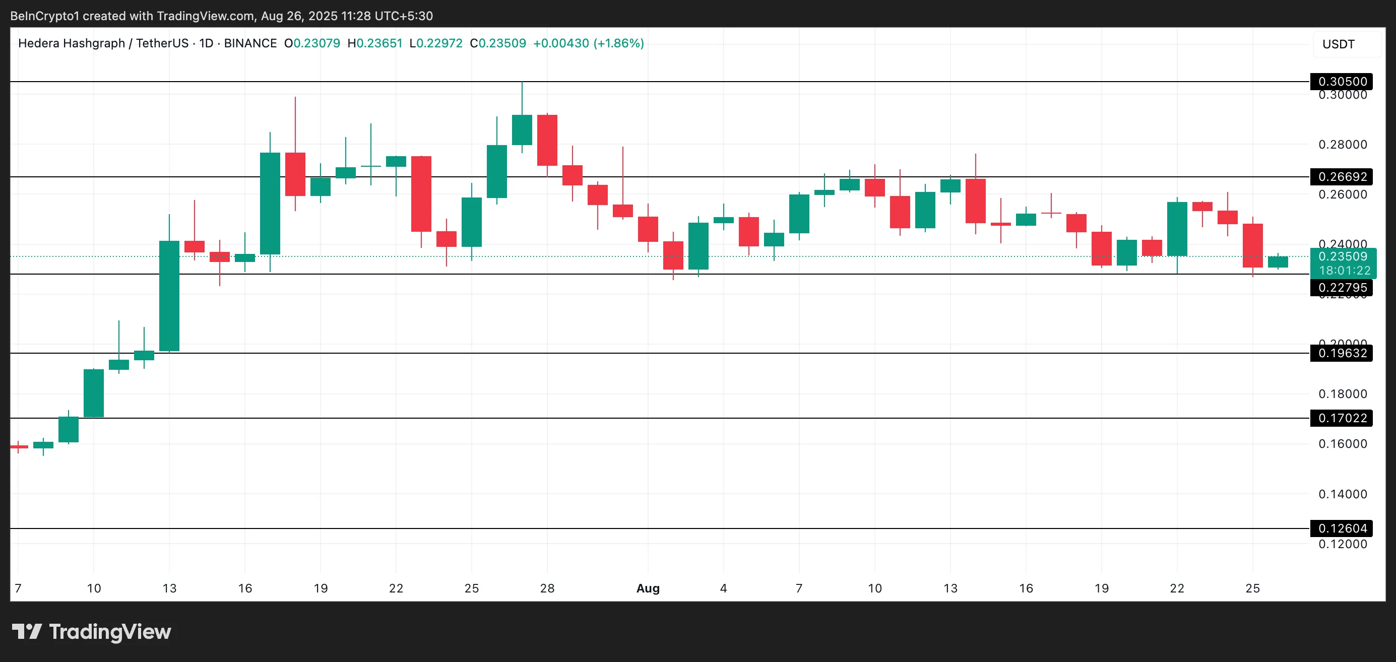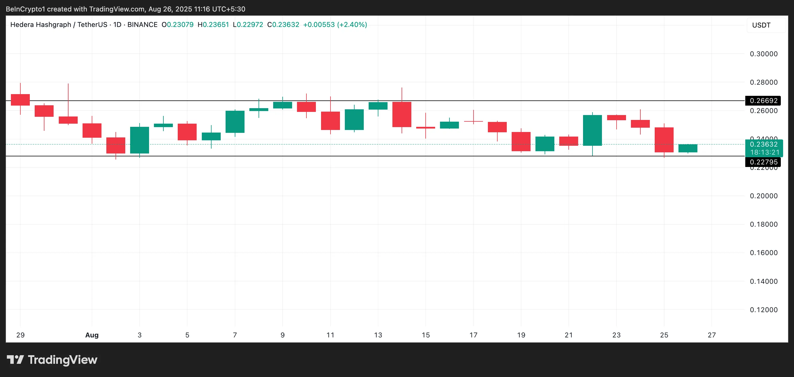HBAR/USD日线图显示,该代币在一个水平通道内交易。在7月的上涨行情推动HBAR于7月27日达到0.30美元的周期高点后,该代币失去了上涨动能并陷入盘整。
