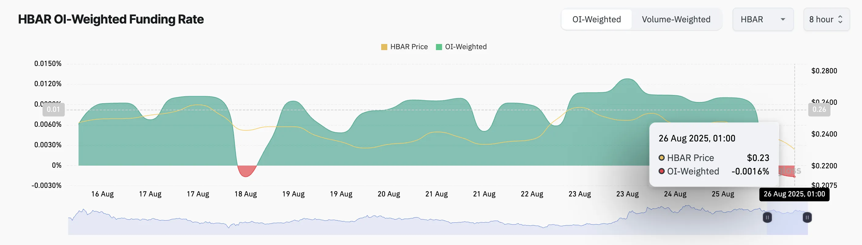 随着链上和技术指标显示空头力量增强,HBAR可能很快跌破0.22美元的支撑位。HBAR的加权资金费率在过去一周首次转为负值,表明空头头寸正在获得关注并加剧。截至发稿时,该数值为-0.0016%。