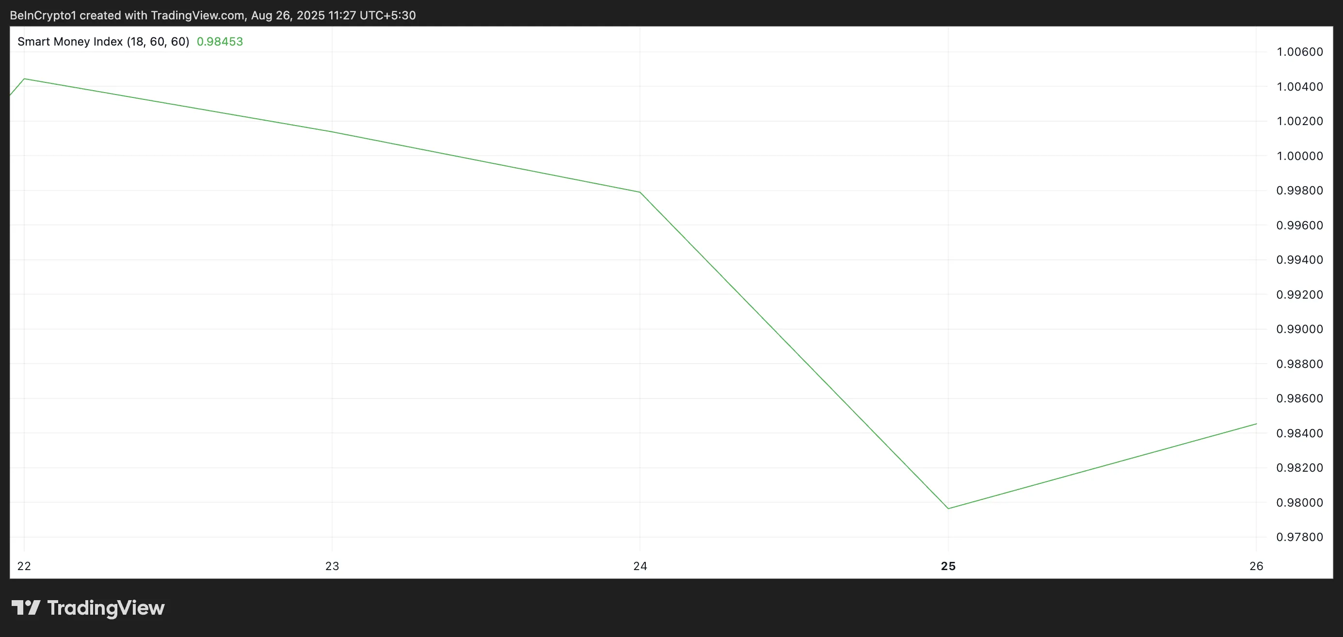 SMI通过追踪交易日特定时段的价格波动来衡量机构投资者的活动。它反映了"聪明资金"在早盘散户驱动行情后的尾盘交易行为。当SMI飙升时,表明机构投资者信心增强,通常预示看涨前景。反之,当该指数下跌时,意味着这些投资者对持有资产兴趣减弱,正在获利了结。