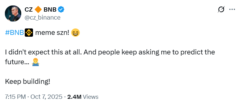 - 近期涨势部分源于币安前CEO赵长鹏的社交媒体背书,推动模因代币热度飙升