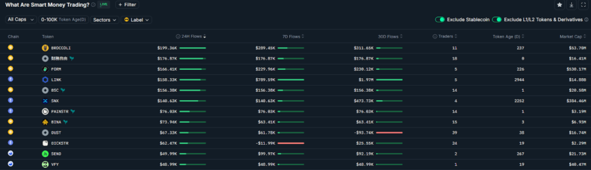 区块链分析平台Nansen数据显示,追踪链上交易的成熟投资者明显偏爱BNB原生代币。过去24小时内这些交易者买入的三大资产均为BNB链原生代币,大量资金流入表明机构兴趣正在增长。