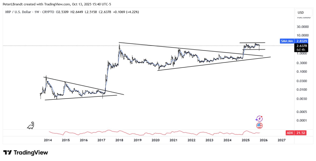 以经典图表分析闻名的资深交易员彼得·布兰特近日分享了对XRP长期价格形态的独到观察,称其为"更纯粹的长期图表"。这份附有XRP/USD多年走势图的观点迅速引发分析师和交易者的热议。