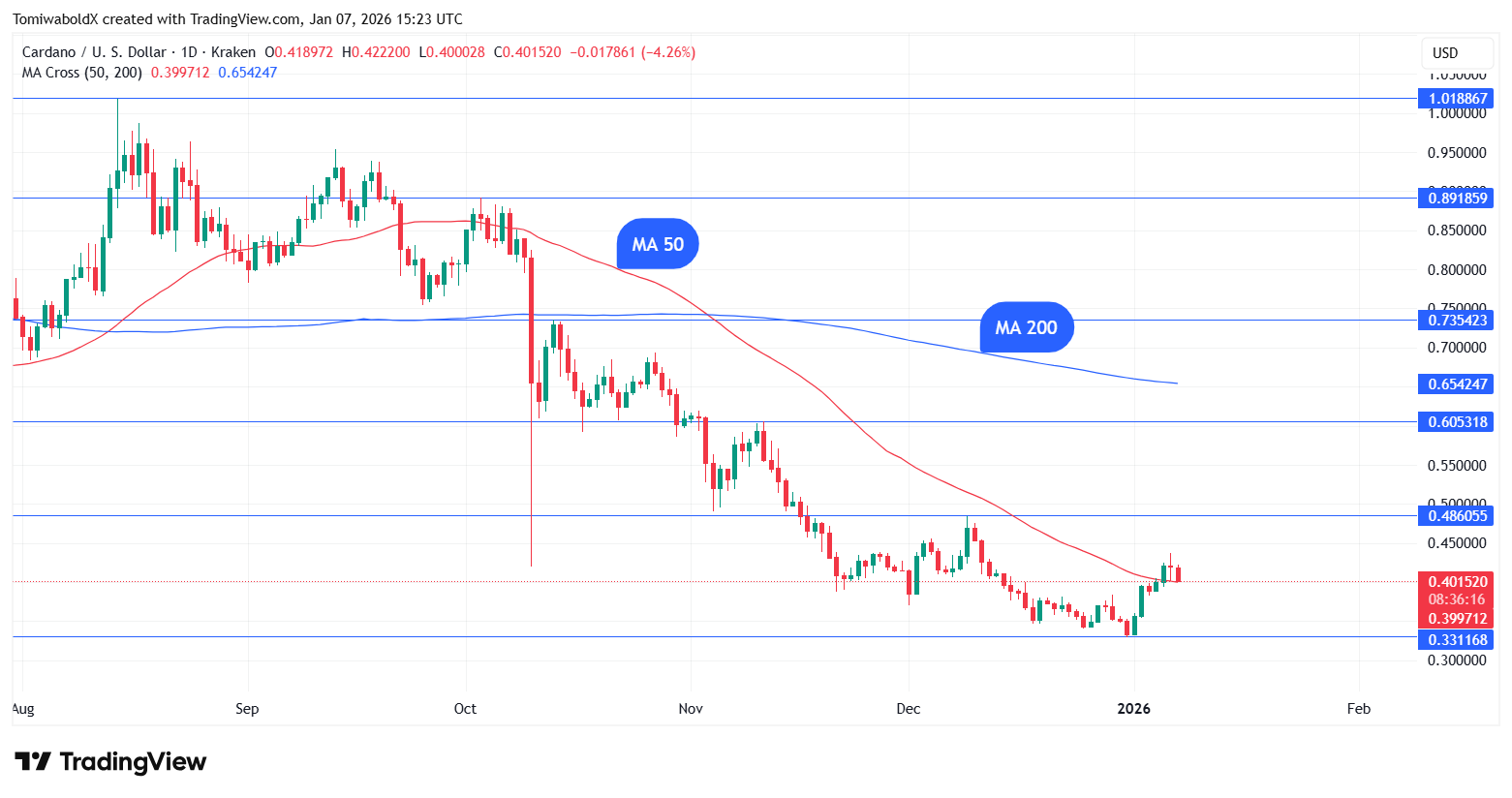 2026年初经过四日连涨,ADA曾触及0.437美元高点,但遭遇阻力后迅速回落。自周二起连续两日下跌,当前正测试0.4美元支撑位,该位置与日线MA50重合——周三早盘已触及此水平。若日线MA50能形成短期支撑,将增加ADA延续涨势的可能性。